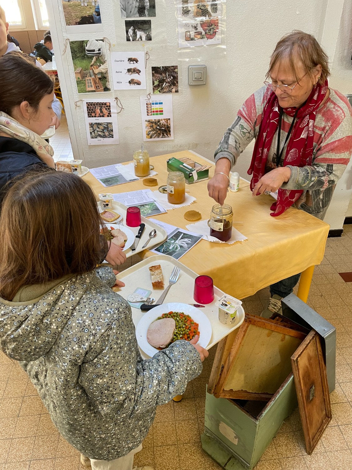 Pour faire écho à cette action pédagogique, une apicultrice locale a fait découvrir son activité à deux classes de 6e et a animé un atelier de dégustation de miel de sa production au restaurant scolaire le jeudi 27 novembre. Les convives ont nappé de miel les desserts préparés en cuisine par deux élèves de 6e volontaires et tirés au sort. Panacottas, ramequins de fromage blanc, autant de desserts à préparer pour les quelque six cents élèves demi-pensionnaires au côté de la cheffe cuisine et de son équipe dynamique.